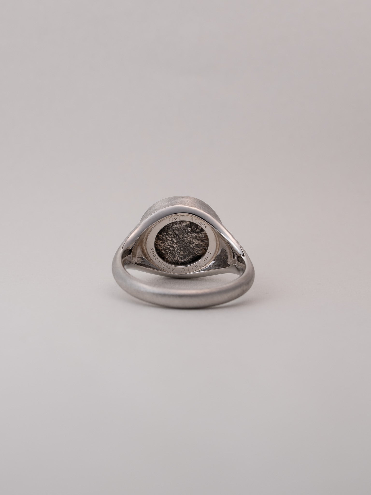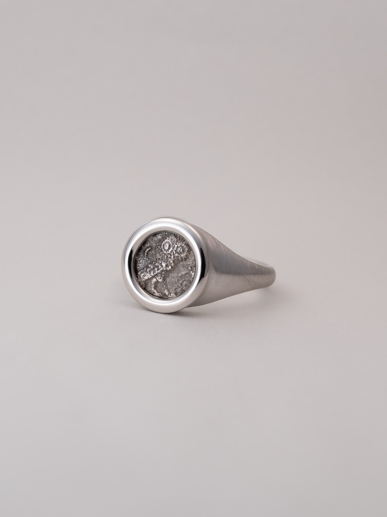 角を落とした柔らかな印台フォルムがコインの佇まいを穏やかに受け止め